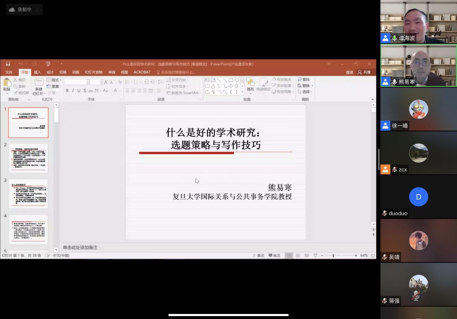 公共管理研究生论坛通过腾讯会议顺利举办。复旦大学国际关系与公共事务学院副院长、教授熊易寒受邀担任本场活动的主讲人,做了题为“什么是好的学术研究?——社科论文的选题策略与写作技巧”的学术讲座。日韩无码