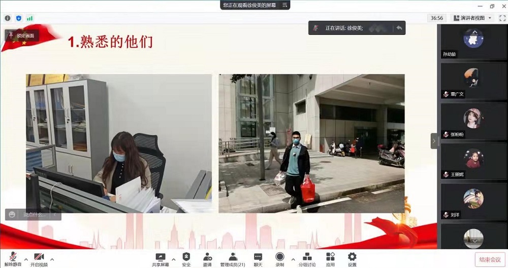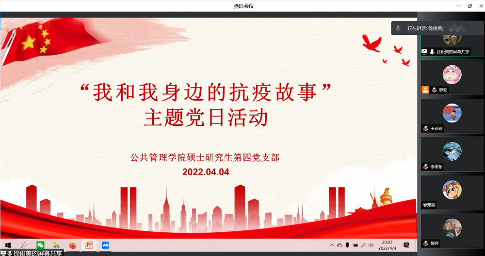 硕士研究生第四党支部开展“我和我身边的抗疫故事”线上主题党日活动,活动由支部书记徐俊美主持,支部全体党员参加。