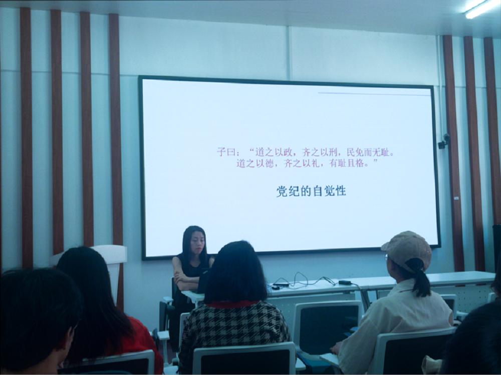 程聪慧老师强调加强纪律建设是全面从严治党的治本之策,带领同学们从中国共产党的组织原则、中国共产党的纪律、如何自觉遵守党的组织原则和纪律以及中国共产党的作风建设四个方面进行深入学习。