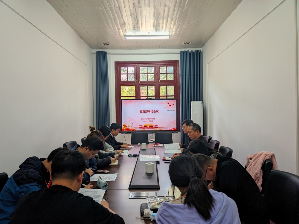 宋杰首先传达了学校第十次党代会筹备工作动员部署会的会议精神,强调学校第十次党代会将对学校未来五年的学科布局、发展方向等重大事项进行讨论与决策,要求各党支部要高度重视、认真对待这次会议,按要求做好党代表推选、两委委员提名等工作。随后,宋杰就主题教育和“组织建设年”相关工作进行了指导,要求各党支部要加强对师生的关心,挖掘师生中的好人好事,及时做好信息的收集和报送,讲好“公管人”故事。同时,宋杰号召全体党支部书记和党员,为即将开展的“湖南省第六届高校公共管理案例大赛暨第六届公共管理学科院长(系主任)论坛”当好志愿者,发挥战斗堡垒和先锋模范作用。