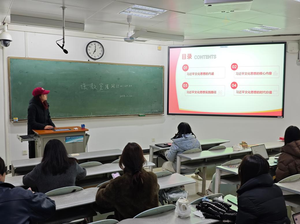 硕士研究生第四党支部在水教 509 开展了主题党日活动暨 “习近平文化思想学习纲要” 党课学习,会议由支部书记黄建丽主持。此次会议还吸收了入党积极分子及入党申请人一同听党课。