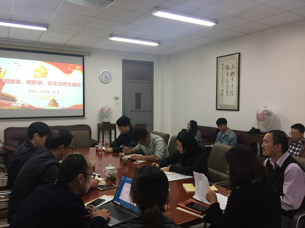 党委举行领导班子“不忘初心,牢记使命”主题教育活动第二次集中学习,学习专题为“担使命、履职责,矢志为师生服务”。会议由院党委书记付蓉芬主持,由院长李连友同志、副院长徐莹(民主党派)主讲,院领导班子成员及全体党支部书记参加会议,学校第三督导组党委教师工作部副部长鲁阿庆同志出席会议。