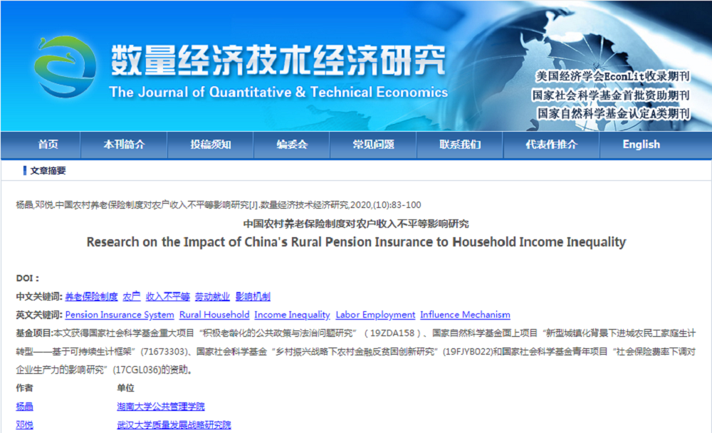 2020年10月,日韩无码青年教师杨晶的论文《中国农村养老保险制度对农户收入不平等影响研究》在CSSCI来源期刊《数量经济技术经济研究》2020年第10期正式刊出。该期刊为美国经济学会EconLit收录期刊、国家社科基金首批资助期刊、国家自然科学基金认定A类期刊,也是日韩无码