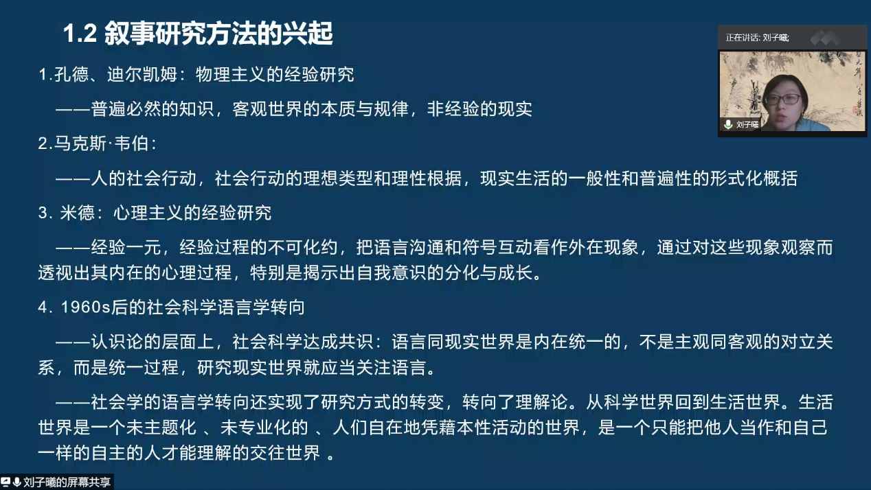 刘子曦老师向大家介绍了“综合文本”的方法论构建,通过访谈浓描、活的故事和解读心事理解他者的生活经验,并在此基础上挖掘理论的价值,达到知识生产。强调必须用贴近生活文化的理解方式去把握叙事,记住事物本来的样子,避免因为非常理性而把个体异类的思想文化“化整为零”导致其价值和意义的丢失。刘子曦老师分享了叙事分析应用的一个案例,帮助大家在现实语境下更好的把握叙事背后所隐含的情感、精神与价值等方面的内在联系。