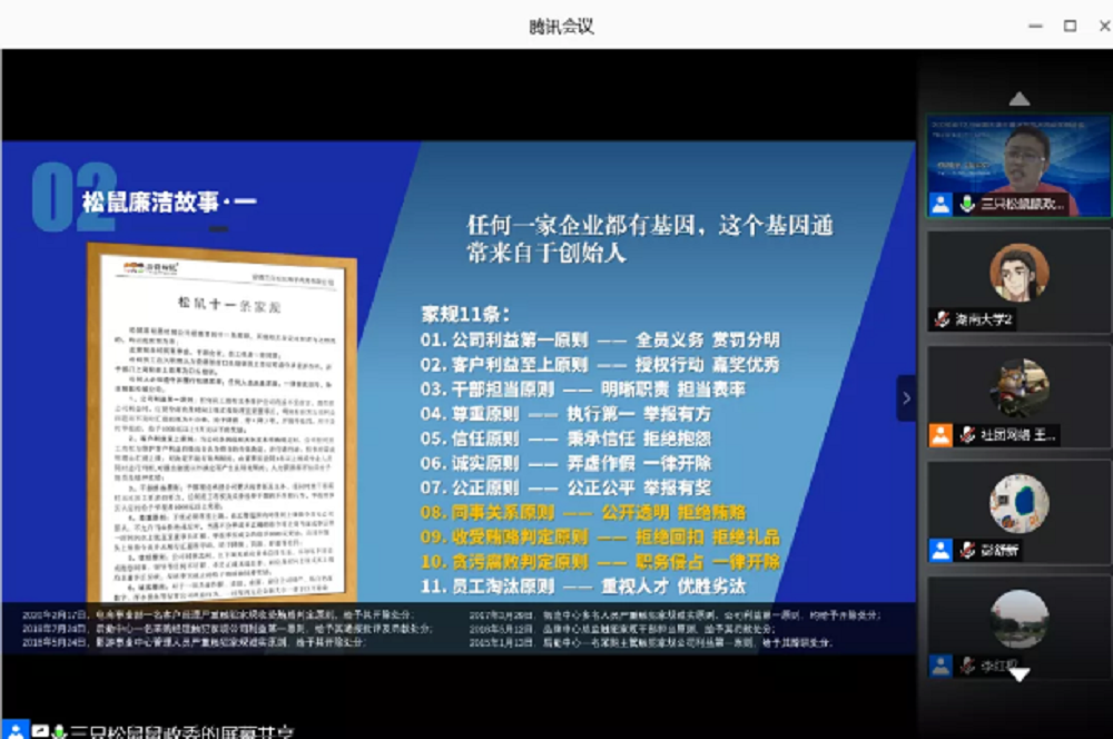 在廉政学会的统一安排下,学社邀请到三只松鼠股份有限公司党委书记潘道伟先生主讲“三只松鼠建设廉洁企业的实践探索”、廉政学会会长任建明教授主讲“廉洁建设是每个公民的责任”、世茂集团审计总监贾俊卿“共同创建企业廉洁生态的世茂探索”,吸引了来自全国47所高校的超过12000人次大学生共同参与此次系列讲座活动。讲座结束后,学社积极组织参与同学交流感想和体会,同学们表示讲座后对廉洁教育有了更深刻的认识。