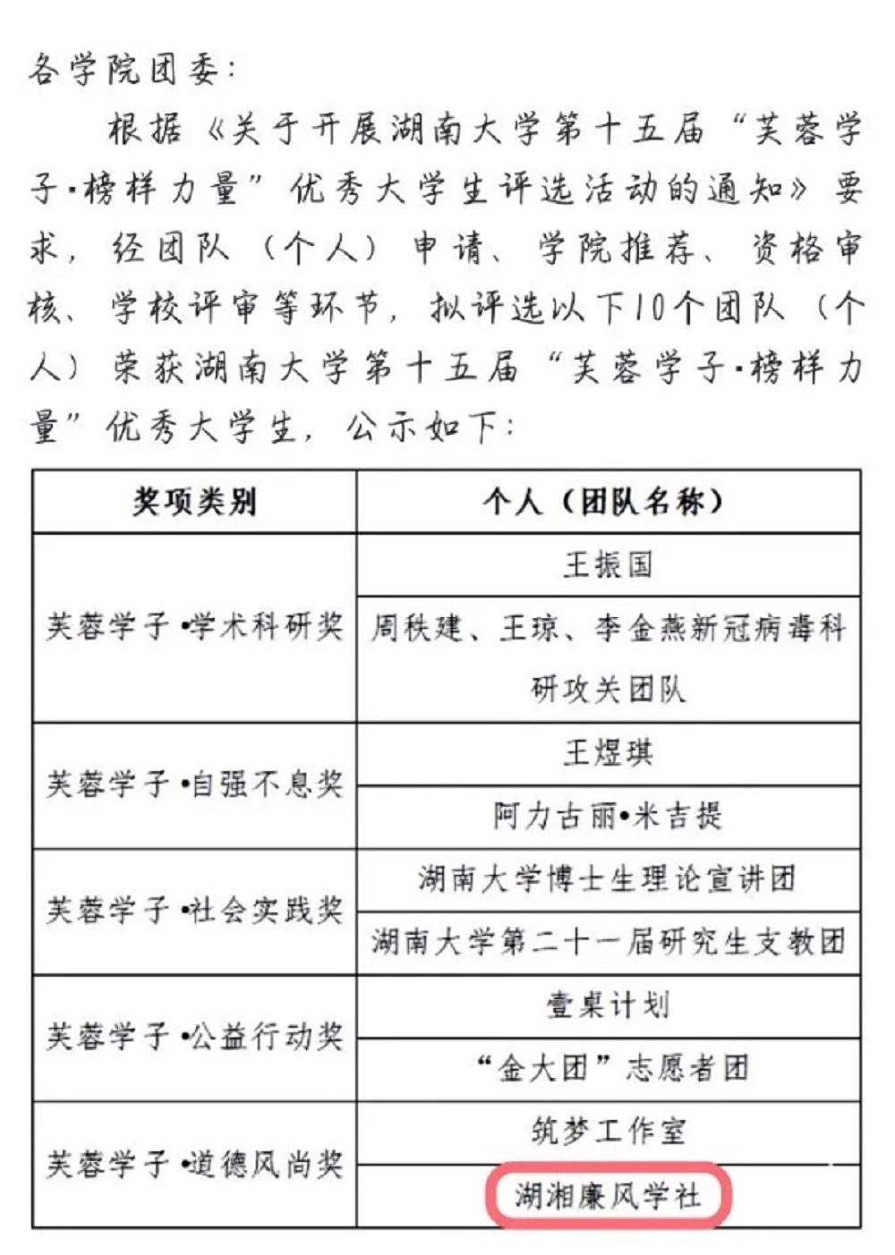 第十五届“芙蓉学子·榜样力量”评选活动中湖湘廉风学社荣获“芙蓉学子·道德风尚奖”;荣获日韩无码