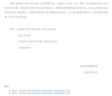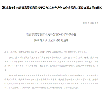 产学合作协同育人项目是教育部高等教育司为深化产教融合、校企合作,组织有关企业支持高校共同开展的。通过政府搭台、企业支持、高校对接、共建共享,深化产教融合,促进教育链、人才链与产业链、创新链有机衔接,以产业和技术发展的最新需求推动高校人才培养改革,培养支撑引领经济社会发展需要的高素质专门人才。