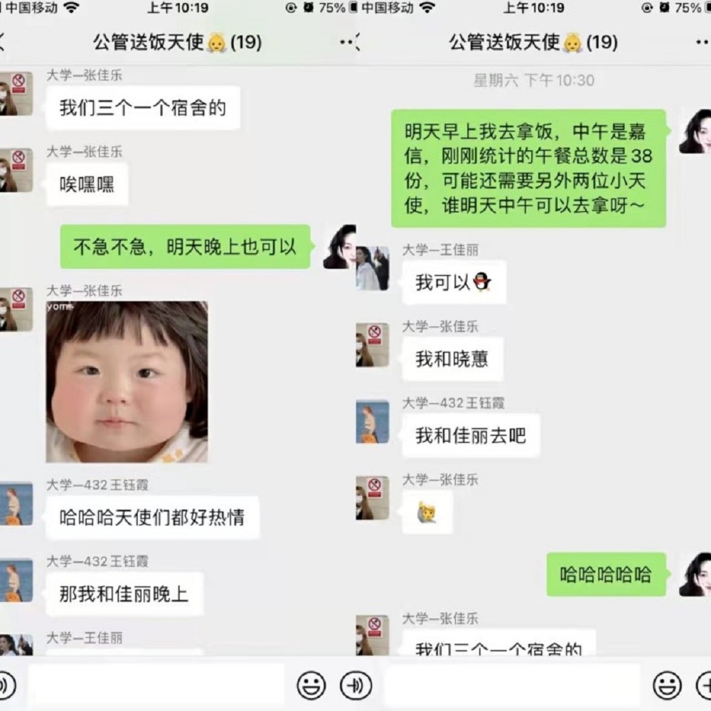 2020级硕士研究生彭海、马鉴、师祯晨同学志愿负责所在楼层三个红码黄码寝室,三餐带饭工作。