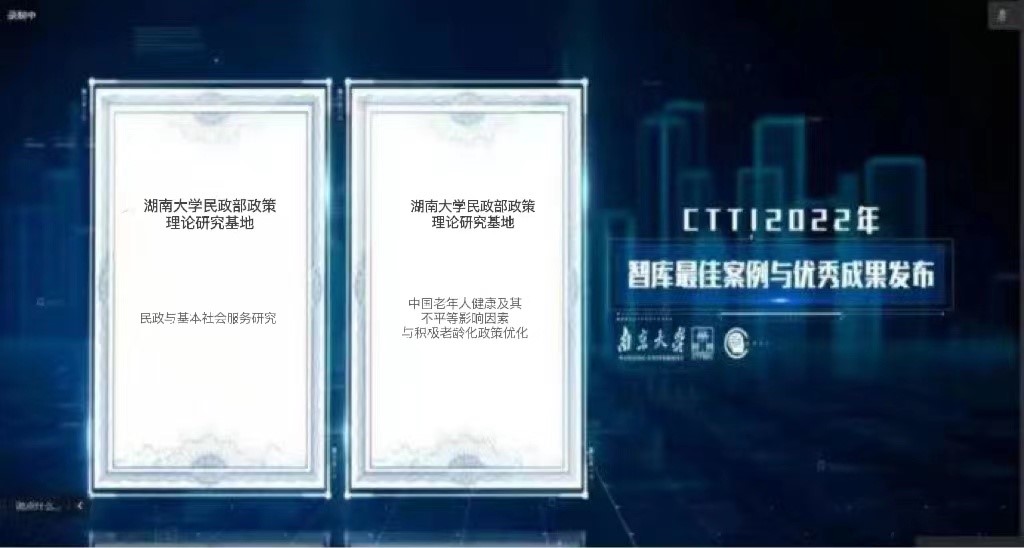 2022年12月17日,“2022新型智库治理论坛”在江苏南京举行,来自全国智库界、思想理论界的700多位专家和智库负责人以线上与线下结合的形式参加论坛。会上,南京大学中国智库研究与评价中心、光明日报智库研究与发布中心重磅发布了CTTI2022年度智库优秀成果获奖名单。日韩无码民政部政策理论研究基地报送的《民政与基本社会服务研究》荣获2022年度CTTI来源智库优秀成果最高奖——特等奖。