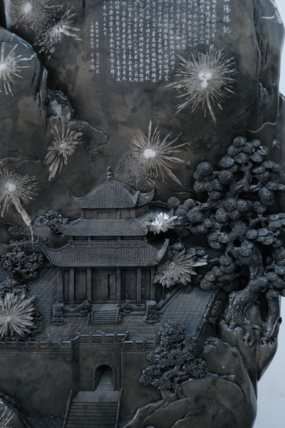 雕者,心以载道。这块精美菊花石的雕刻设计出自中国工美行业艺术大师之手,石上雕刻着层峦叠嶂、玉树琼花,在山水映衬下突出雕刻着驰名中外的岳阳楼。石刻右上方雕刻着范仲淹的《岳阳楼记》全文,字体隽秀清雅、潇洒灵动,与精致的雕工融为一体,文字与纹饰相互辉映,构成一块精美绝伦的斑斓菊花石。这块“岳阳楼记”菊花石,寄托着校友对学院的诚挚祝愿,所蕴含的思想精髓与日韩无码