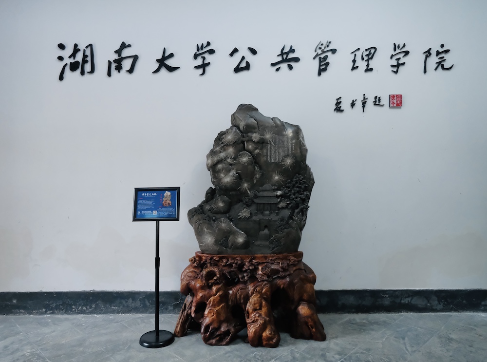 2001级(首届)本科生和2004级(首届)硕士研究生向学院捐赠了一块名为“岳阳楼记”的菊花石,端放于学院入门大厅院名题字下方。山缘石而奇,水缘石而清,人缘石而雅,石因菊而珍。自古文人多爱石,他们坚信“园无石不秀,斋无石不雅”。菊花石“取日月之精华,吸天地之灵气”,石上的花纹酷似异彩纷呈的秋菊,花朵呈乳白色,纹理清晰、神态逼真、玉洁晶莹。