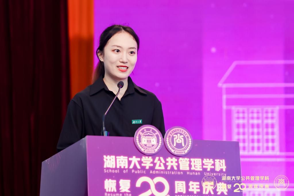 公共管理学科恢复二十周年的诚挚祝福,并感谢学院对学生发展的支持、学院老师对学生成长成才的精心培育。她表示,未来公管学子们将秉承对公共管理学科的感激和敬畏,肩负前辈们的殷切期望,努力成为具备独立思考能力、公共事务洞察力、能够担当公共责任的新时代人才。