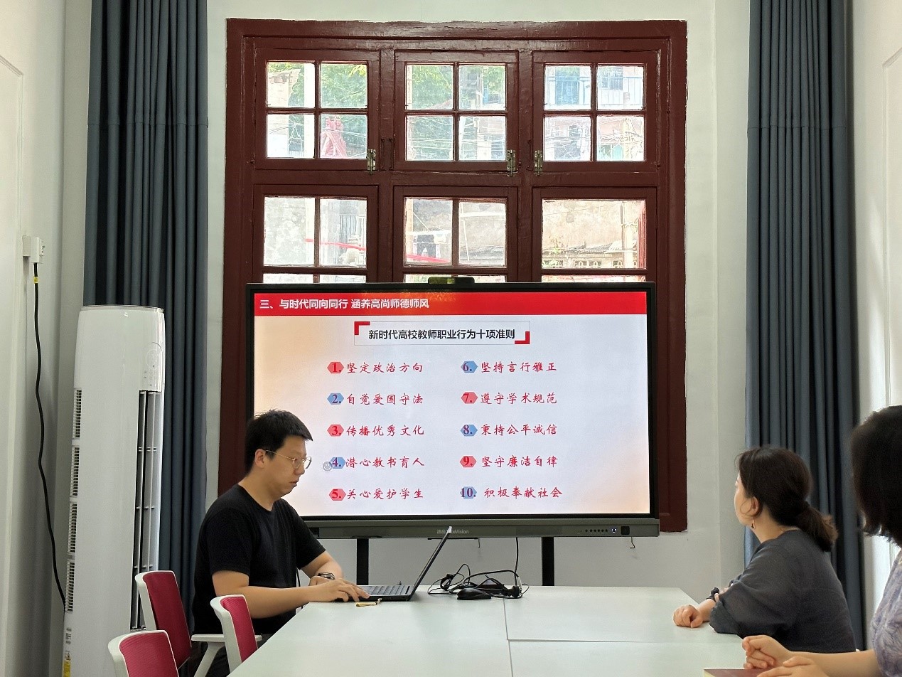 首先,李释然同志带领大家学习了《正师德 强师风 做新时代四有好老师》等师德师风建设相关文件,再次重温了《新时代高校教师职业行为十项准则》。