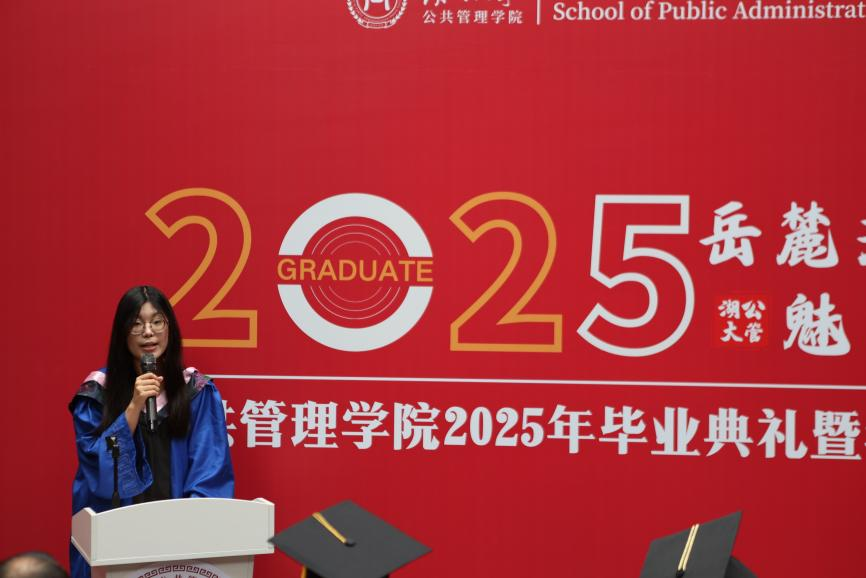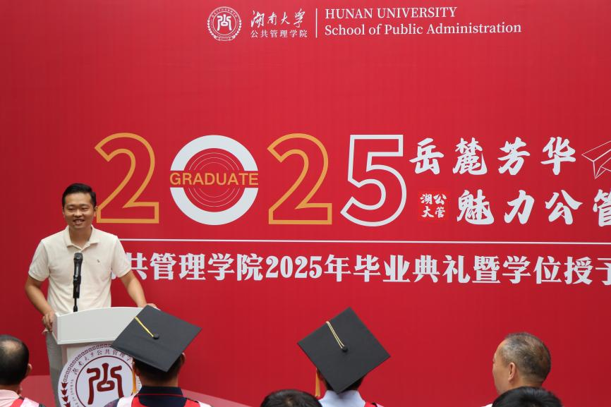 班主任老师任皓代表学院老师对顺利完成学业的毕业生们致以真诚祝贺。他进一步分享了对公共管理的认知:公共管理的魅力不在于证明已知,而在于发现未知;强调永远保持对世界的好奇心,不断发现世间万物的因果关系。任老师希望同学们能以专业能力和态度应对挑战,践行“知识报国”。