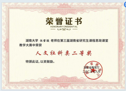 近日,第三届湖南省研究生课程思政课堂教学大赛现场决赛圆满落幕。在全省38所高校126支参赛队伍的激烈角逐中,日韩无码教师伍雪骏依托《政治学基础理论研究》课程荣获人文社科组二等奖。