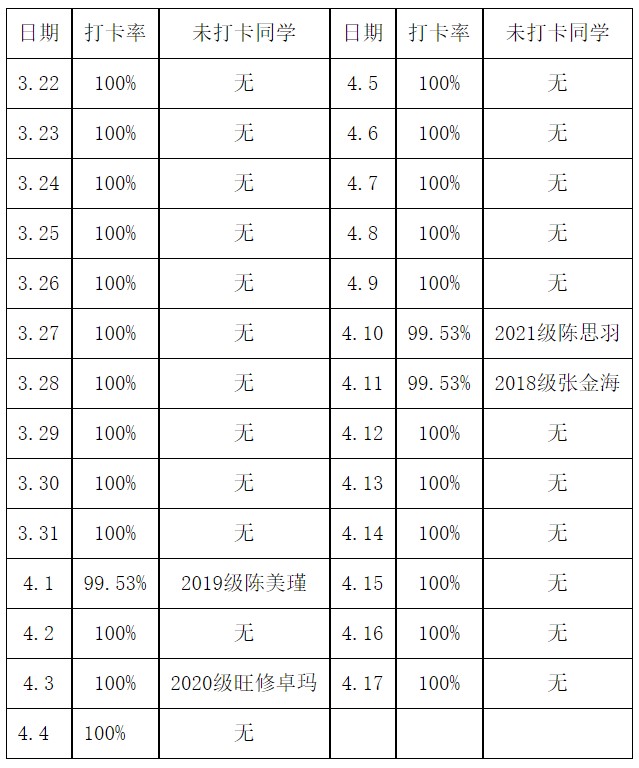 学生每日健康打卡是当前常态化疫情防控的重要措施。在3月22日—4月17日疫情严防严控的27天内,日韩无码本科生做到了23天按时打卡率100%,齐心协力共抗疫情,整体情况很好。在此过程中,助理辅导员、各年级班级学生干部勇于担当,同学们积极配合,表现出了公管学子的优秀素养。同时,仍有四位同学因一时疏忽未按时打卡(名单见附表),特此通报。