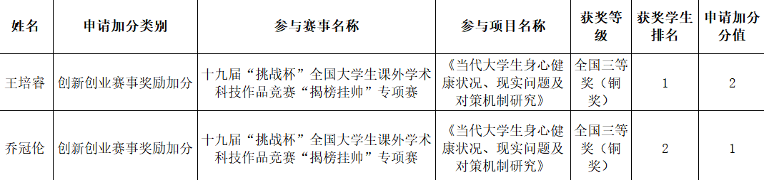 根据关于开展2026年推免生创新创业赛事、艺术类赛事奖励加分及志愿服务类专项评价成绩认定工作的通知,经过学生自主申报、学院推免生推荐工作小组审议,现将推荐结果公示如下: