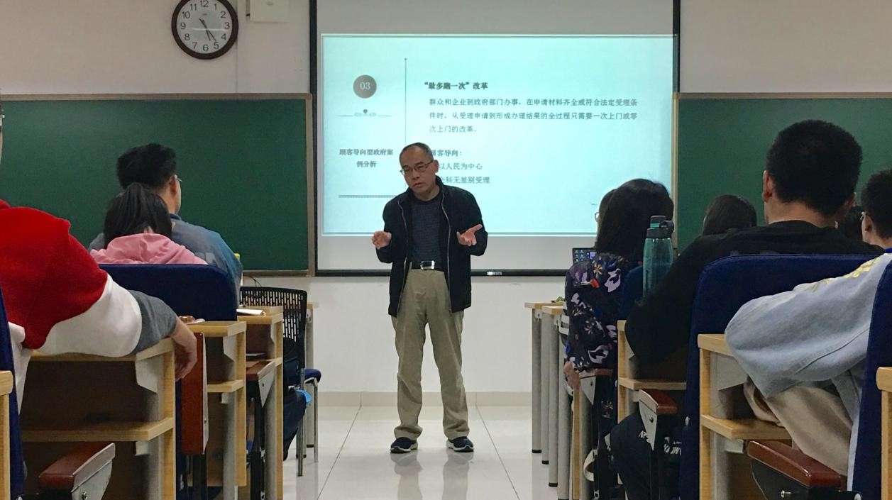 紧接着由行管二班的同学们为大家分享《改革政府》这本书,四个小组分别选取了书中的5条原则并为大家详细解释了这5条原则的具体内容和含义。首先,由第一组的腊炳辉和张金海同学分享“讲究效果的政府”这一原则,他们通过辽宁省建达县石佛乡低保户的案例总结出政府应把焦点放在后果控制上而不是扩大编制、扩张权力与利益等方面。接着,由第二组的段瑞洋同学为大家介绍了“竞争性政府”的含义及公共服务如何引入竞争机制。随后,第三组的唐研演和刘昱呈同学分别为大家讲解了“起催化作用的政府”和“社区拥有的政府”两条原则,并强调政府应当掌舵和授权。最后由第四组的周新梅和张蓉两位同学介绍“顾客导向的政府”原则,并通过案例分析总结出政府应成为以人民为中心的政府。