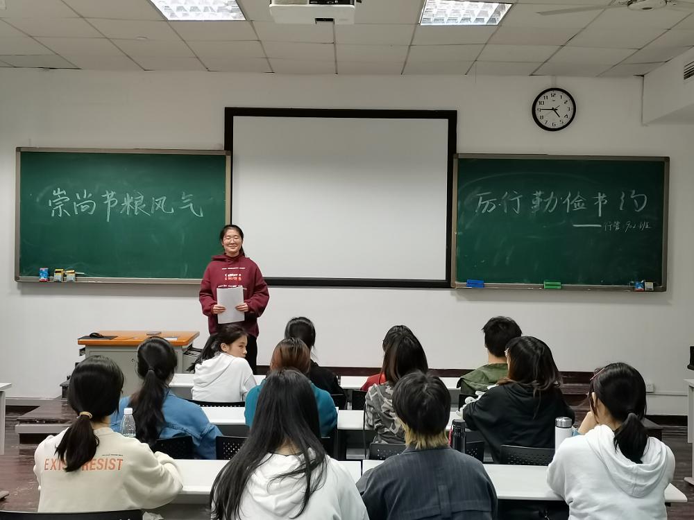 为深入学习习近平总书记关于节约粮食的重要讲话精神,增强厉行节约、反对浪费的意识。11月13日,行政管理1902班于中楼205召开“崇尚节粮风气,厉行勤俭节约”主题班会。本次班会由班长李欣玉主持,1902班全体同学参加。