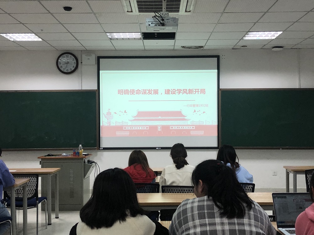 为建设优良学风,鼓励同学们团结共进、凝聚班级向心力,4月19日,行政管理1902班于研究生院楼C102教室组织召开了“明确使命谋发展、建设学风新开局”主题团课。本次团课由团支书李宏圳主持,1902班全体同学参加。