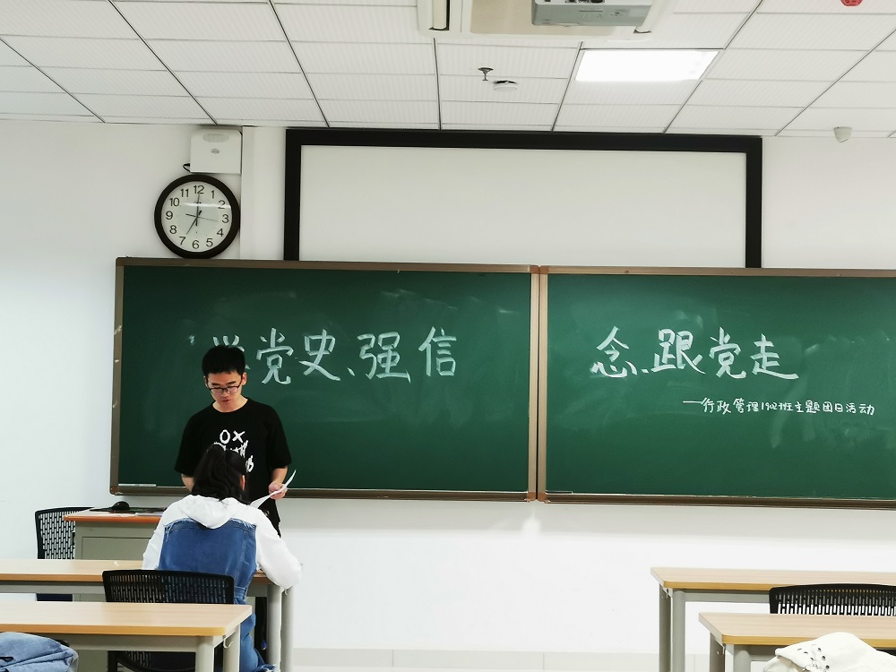 为庆祝中国共产党成立100周年,深入贯彻落实习近平总书记关于做好新时代青年价值引领工作的重要论述,5月8日,行政管理1902团支部于研究生院楼B303召开 “学党史,强信念,跟党走”主题团日活动。本次活动由团支书李宏圳主持,1902班全体同学参加。