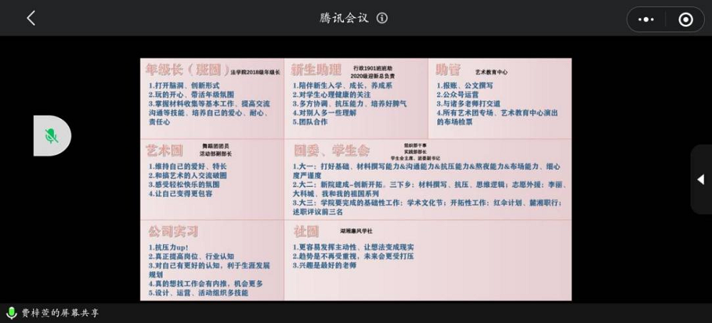 “青麓训练营”最后一期朋辈圆桌会如期举行。应疫情防控要求,本次活动采取线上会议的方式进行。本次会议由王欣平同学主持,并邀请到行政管理18级保研至西安交通大学的费梓萱同学和跨专业保研至中国科技大学的华蕾同学主讲,青麓训练营全体营员参与了本次朋辈圆桌会。