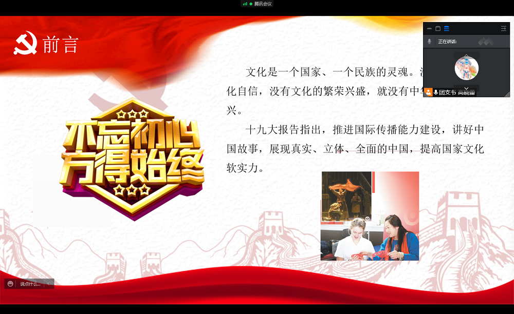 首先,高晓蕾同学向大家强调了文化自信的重要性。文化是一个国家、一个民族的灵魂。文化自信,是更基础、更广泛、更深厚的自信,是更基本、更深沉、更持久的力量。十九大报告中指出,要推进国际传播能力建设,讲好中国故事,提高国家软实力。学习十九大精神,坚定文化自信,是所有青年学子的责任与使命。