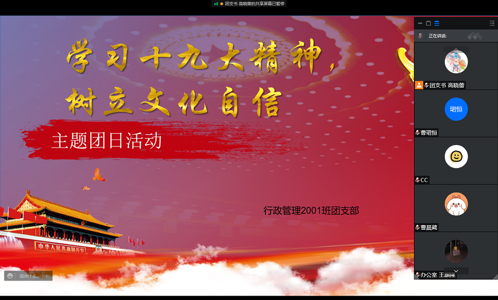 行政管理2001班开展主题团日活动。此次活动以“学习十九大精神,树立文化自信”为主题,由行政2001班高晓蕾同学主持,行政2001班全体同学参与。按照疫情防控相关规定,活动采取线上方式进行。
