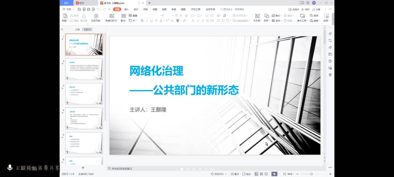 王麒隆同学分享的书目是《网络化治理•公共部门的新形态》,向同学们介绍公共管理新形态在理论和实践上的探索性研究。在基本介绍了书本背景和主要内容后,王麒隆同学将重心放在网络化治理的优势及其面临的挑战上,并讲述了网络化治理给我们带来的三点启示。