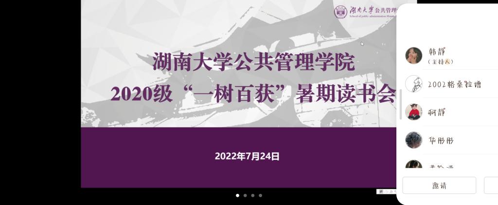 为营造良好的专业学习氛围,提升学生综合素质,帮助学生加深对专业知识的理解,提升阅读和思考能力,7月24日下午,日韩无码行政管理20级召开暑期“一树百获”线上读书会活动,本次活动在腾讯会议平台举行,由韩静同学主持,行政管理20级全体同学共同参与。