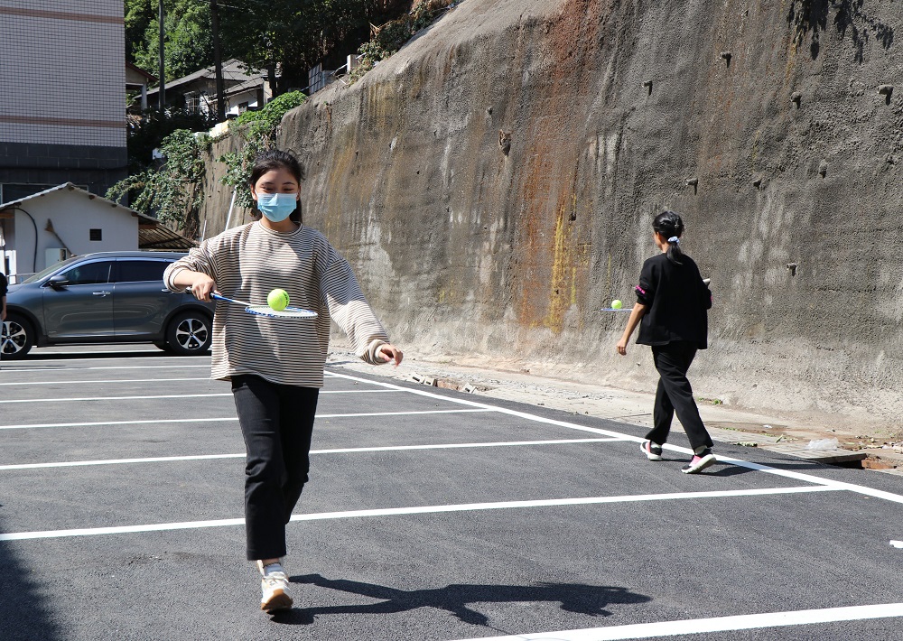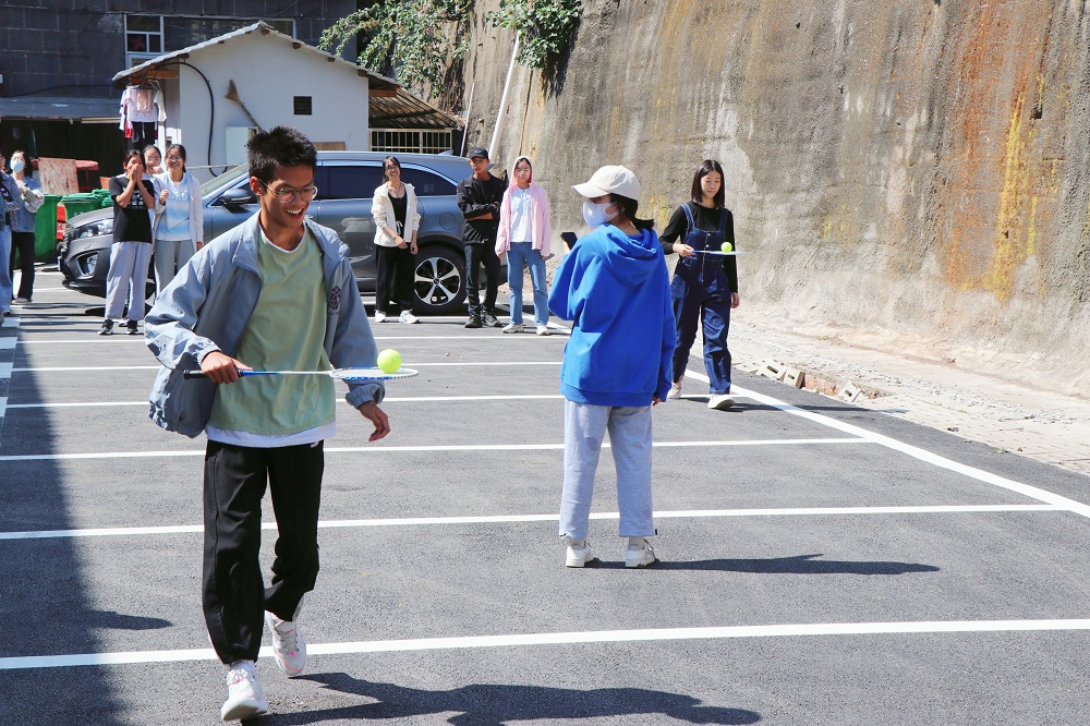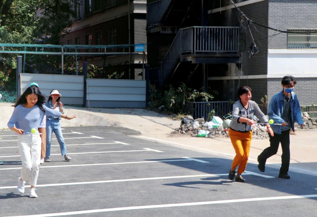 “比赛过程中队员不能与球接触,在过程中球不能落地,并原地将球放置球拍再继续,若没有将球运到终点成绩无效。”这是一场对平衡的考验。每一轮由两支队伍同时进行比赛。比赛伊始,大家格外小心谨慎,生怕网球脱离了球拍前功尽弃。慢慢的,大家渐入佳境,许多同学可以稳稳地举着球拍大步流星地奔向终点。每一轮的领先小组总会在顺利传完球后激动得跳起来欢呼。