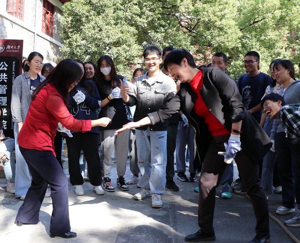 经过短暂的中场休息,友谊拔河赛在院楼前坪拉开帷幕。同学们和老师们通力合作,“一二一二”的口号声在院楼前回响,每一个人都奋力握绳,全力以赴,赛出了公管风采!在前两轮的比拼中,大家拉出来1:1的成绩。最为激动人心的最后一轮由雷院长和付书记通过剪刀石头布确定双方的比赛站位,大家咬紧牙关,使出所有力劲,最终单数组赢得了胜利。
