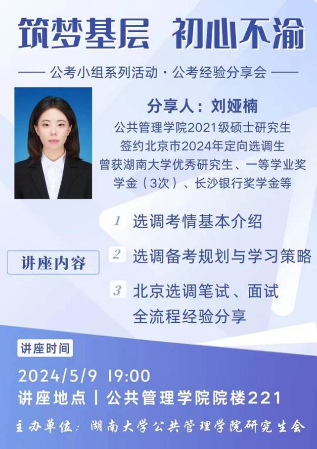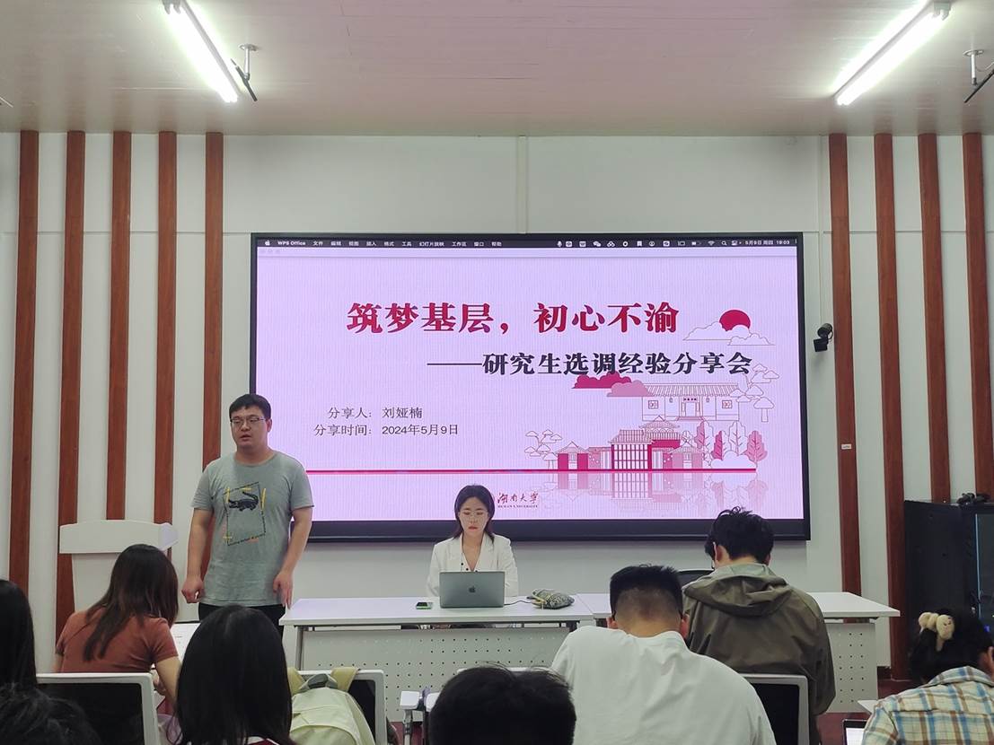 5月9日晚,日韩无码 于院楼221教室举行公考小组系列活动之公考经验分享会。本次分享会由院研究生会发展服务部组织,邀请了刘娅楠同学作为主讲嘉宾,主题为“筑梦基层、初心不渝”。本次分享会反响热烈,效果良好,极大提升了同学们的备考热情与效率,进一步促进了日韩无码就业工作高质量发展。