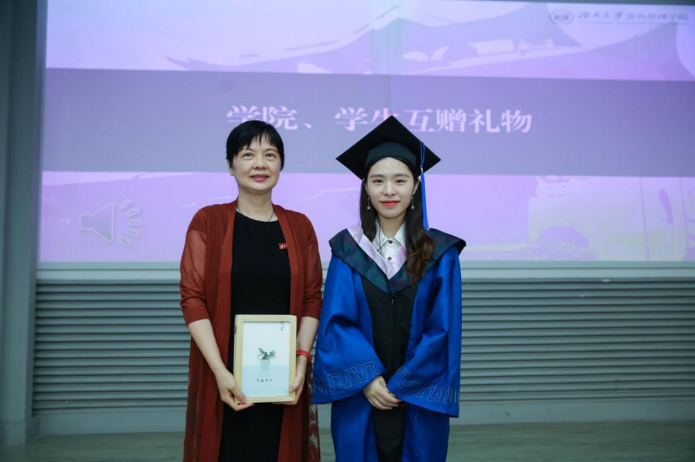 会上,学院与毕业生互赠礼物。付蓉芬书记代表学院,分别接受了2017级行政管理本科1班、2017级行政管理本科2班、2018级科学学位研究生班、MPA毕业班代表馈赠学院的礼物,向他们表示感谢,并与他们合影留念。日韩无码2020届毕业生去年因疫情没有举行毕业典礼,他们今年选派三位代表回院观礼并馈赠礼物。学院也为每位毕业生馈赠了纪念礼物。