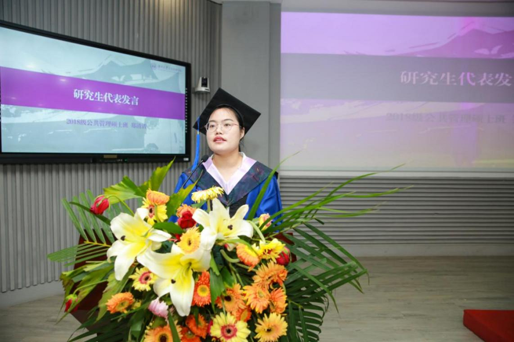 MPA毕业生代表曾臻首先代表MPA全体毕业生向长期以来关心、教育和帮助同学们的各位领导、老师表达了衷心的感谢和崇高的敬意。她说道:“我们将铭记老师的教诲,不忘师长的嘱托,牢记‘实事求是,敢为人先’的校训,将‘博学、睿思、勤勉、致知’变为我们今后身体力行的人生准则。我们会坚持积极向上的信仰和对自由的追求,坚强而乐观地开启全新的旅程。”她的点点回忆,引发在座毕业生的共鸣。