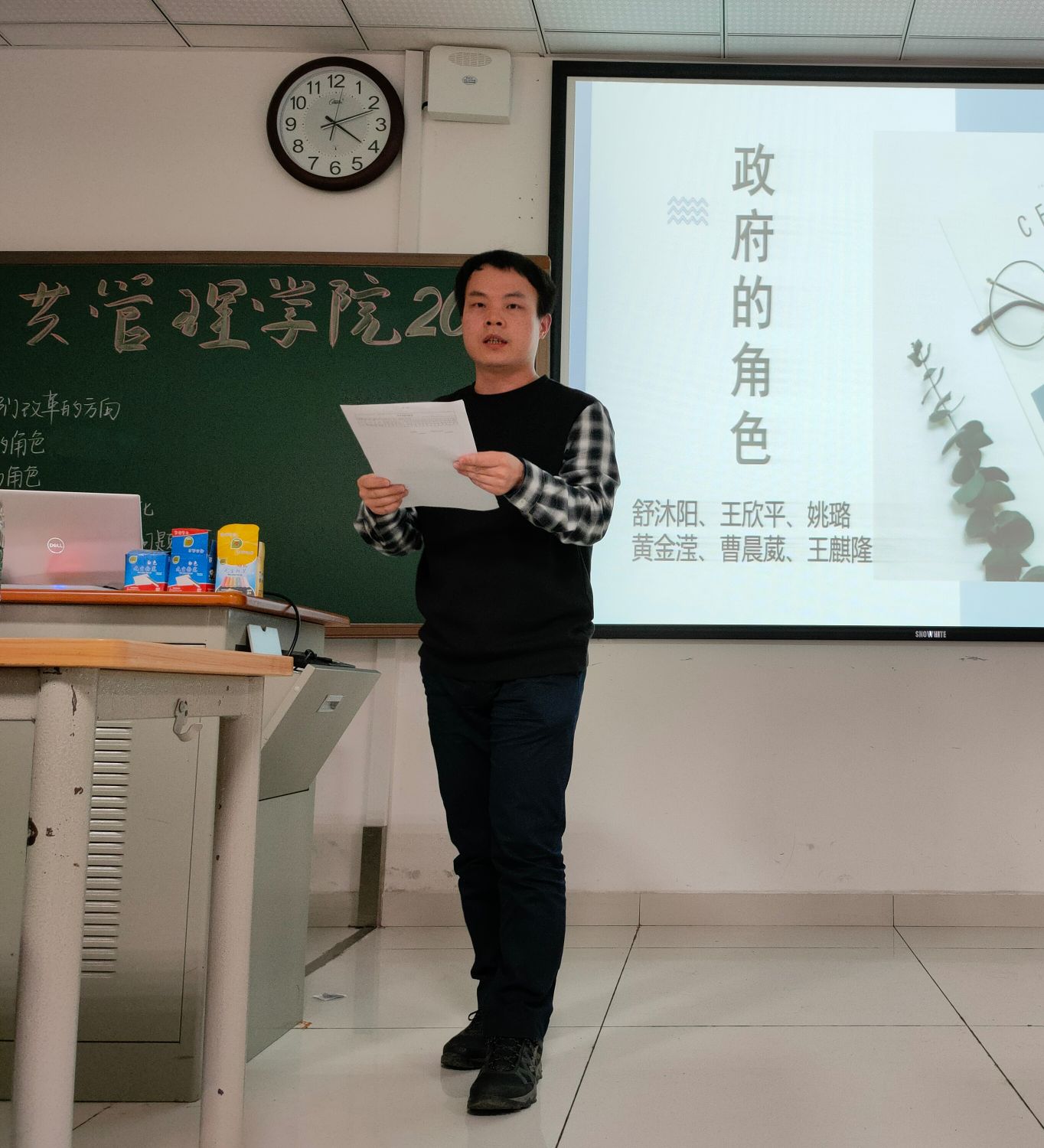 在主持人简单介绍了本次读书会的嘉宾和流程后,管二班首先进行了分享。管二班第一小组成员杨心怡、宋紫睿、滕瑞博同学为同学们介绍了公共行政模式、公共部门改革的动力与原因以及公共管理模式。胡益彰等同学抓住政府干预这一点,详细介绍了政府在经济活动中所扮演的角色。谭北辰、陈凯熙同学介绍了西方政府的公共管理对中国发展的启示。第四小组杨玉美等同学专注于政府角色的强化与弱化,分享了本组成员对政府角色的理解。最后,杨钦喆、王思琦、禚姝彤同学就发展中国家管理主义模式仍存在的问题进行讨论。