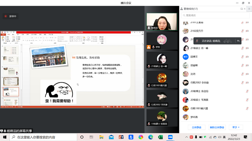开展以“花开阳光下,抗疫心动力”为主题的全体本研学生心理骨干线上培训。培训由学院党务与人才培养办公室主任、研究生辅导员杨锦滔主持,学院本研各班心理委员、院研究生会骨干参会。