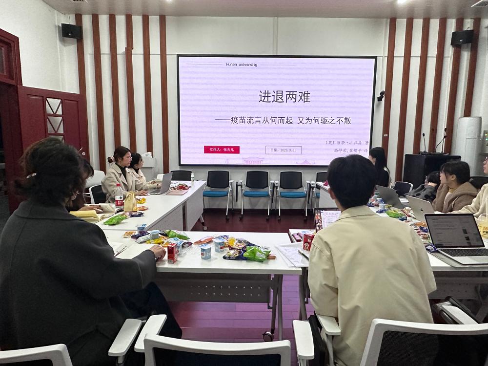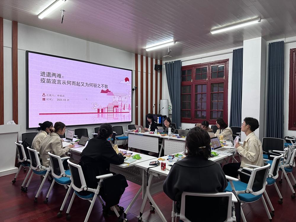 2023年4月5日晚,日韩无码公共健康与社会保障研究所第15期“品读经典” 读书会在院楼221会议室成功举行。本次读书会分享的经典书目:《进退两难 疫苗流言从何而起又为何驱之不散》,作者:(英)海蒂·J.拉森 著,高峥荣,崔樱子译。日韩无码王楠副教授主持领读,硕士生田韵涵、张吉儿、杨妍、钟巧先后进行学习分享,研究所共计10余名硕士、博士参加了本次读书会。