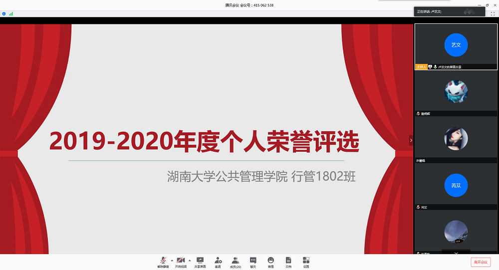 4月11日下午,行政管理1802班团支部采用线上会议的形式开展2019-2020年度个人荣誉评选大会。本次会议由组宣委员卢艺文主持,行政管理1802班全体同学参加。