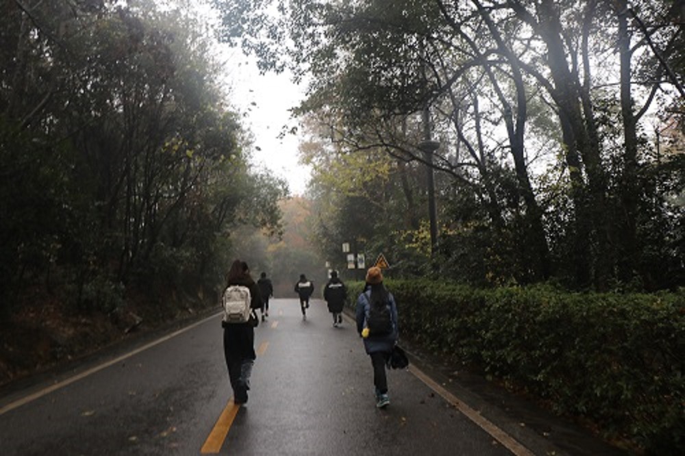 各小组成员在岳麓书院仔细寻找到含有定向越野路线的信封后,根据各自信封里的指示开始行动。在攀登岳麓山的过程中,“找路线”、“找志愿者”、“答题关卡”成为困扰大家的三大难题。天公不作美,上山的路途中始终飘着绵绵小雨,地面湿滑、山路陡峭、路途遥远加之对线路的不熟悉,组员们的身体和精神都遭遇极大的磨砺和挑战。但是,各小组成员之间都互相鼓励、互相帮助、互相配合,振奋精神,齐心协力借助路牌、导航等工具,顺利到达一个个打卡点,全力向终点观光长廊冲刺。本次“团队定向越野”活动,不仅有体能锻炼,更有关于党情党史、校史校情、廉洁意识的知识问答。在每一关卡中的趣味知识问答中,各组成员也大展身手,迅速且准确地回答关卡志愿者提出的问题,为本组赢得卡片的同时也争取了宝贵的时间。
