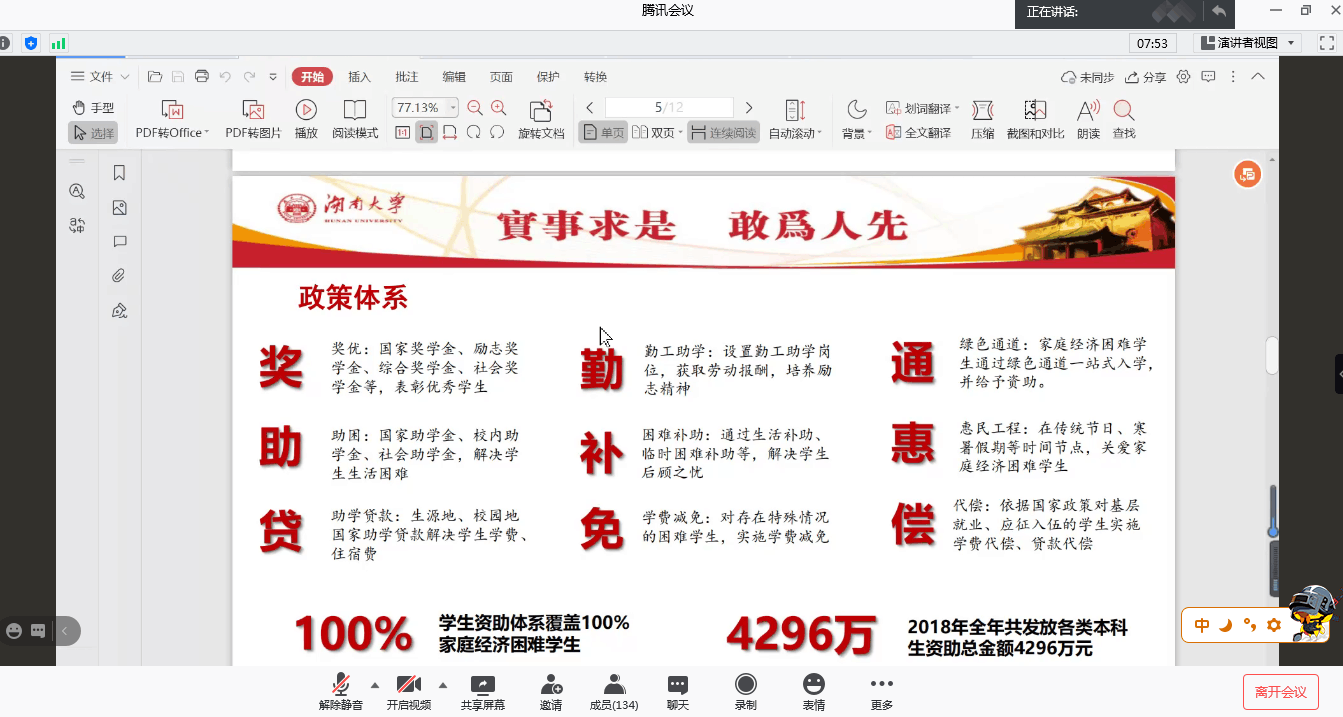 会议伊始,闫老师就资助工作开展的指导思想、工作目标以及工作路径做了简单介绍,让大家对于国家的“四位一体”发展型资助体系有了一个简单了解,随后指出了国家、学校对于学生资助工作的重视程度。接着闫振振老师又为大家详细介绍了由“奖、助、贷、勤、补、免、通、惠、偿”九项资助政策构成的日韩无码