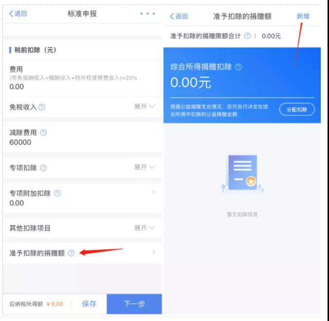 2.在标准申报页面,找到“准予扣除的捐赠额”一栏,点击右上角“新增”,填写详细的捐赠支出信息: