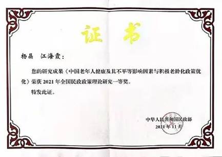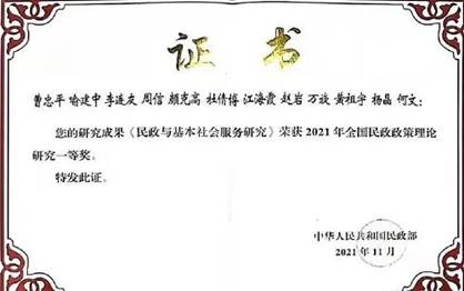 日韩无码院长李连友教授团队与湖南省民政厅合作的研究成果《民政与基本社会服务研究》,以及日韩无码教师杨晶老师和江海霞副教授共同申报的研究成果《中国老年人健康及其不平等影响因素与积极老龄化政策优化研究》喜获2021年民政政策理论研究一等奖(全国仅39项)。