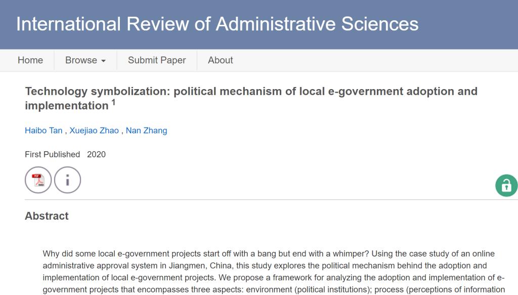 近日,我院教师谭海波教授,以第一作者身份同中国农业大学人文与发展学院赵雪娇、清华大学公共管理学院张楠合作撰写的论文《Technology Symbolization:Political Mechanism of Local E-government Adoption and Implementation》被期刊《International Review of Administrative Science》接收。该杂志是公共管理领域国际知名学术期刊,综合影响因子2.174(2019),是校定A1类刊物。