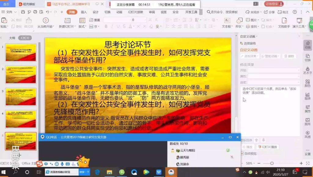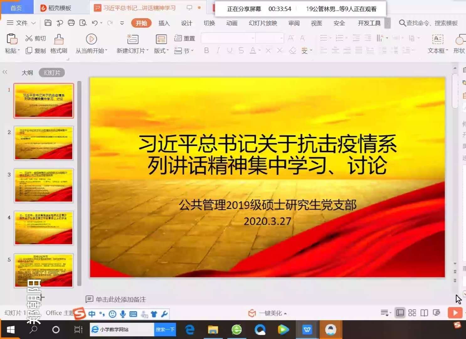3月27日晚上9点,公共管理学院2019级硕士研究生党支部召开支部会议,集体学习习近平总书记关于抗击疫情系列重要讲话精神,本次会议由支部书记郑朝阳主持,支部全体成员参加学习。