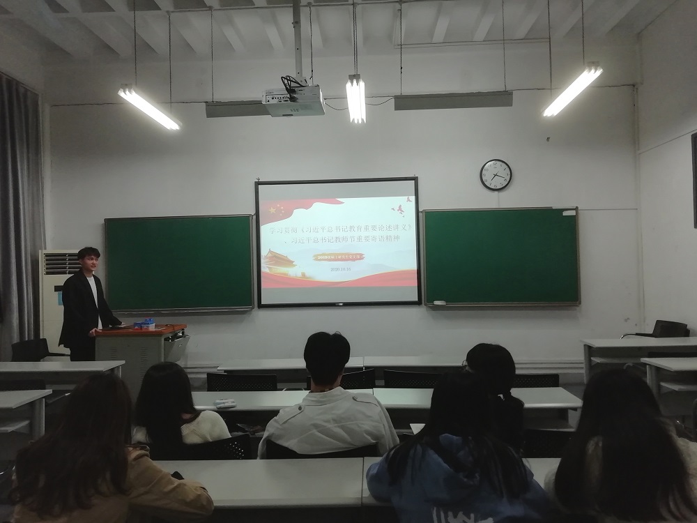 2020年10月16日晚7点,日韩无码2019级硕士研究生党支部在东楼113教室举行“学习贯彻《习近平总书记教育重要论述讲义》、习近平总书记教师节重要寄语等精神”主题研讨会。本次会议由支部书记周杨康主持,全体党员参加了会议,院党委委员、研究生辅导员杨锦滔列席会议。
