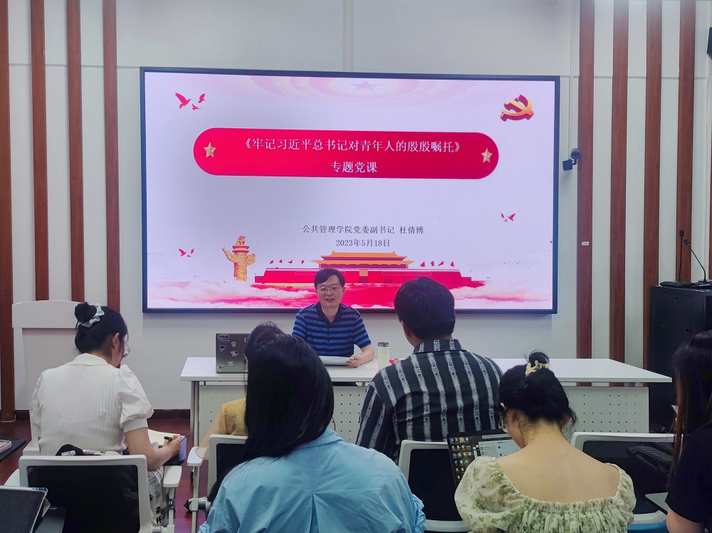 在院楼221教室开展“牢记习近平总书记对青年人的殷殷嘱托”专题党课。学院党委副书记、纪委书记杜倩博主讲,勉励学生们做勇担时代大任的时代新人,本研50余位学生干部参与聆听。