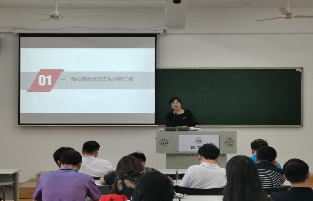 9月27日下午我院在法学楼304召开我院师德建设工作推进会,学院全体教职工参加会议,学院党委书记付蓉芬主持会议并发表讲话。