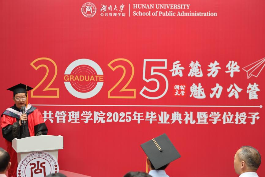 6月18日,公共管理学院在院楼庭院举行2025年毕业典礼暨学位授予仪式。2025届全体毕业生和家长代表,学院学位委员会全体成员,院长谭海波、党委书记宋杰,学院教师代表,在校学生代表参加。学院党委副书记、纪委书记杜倩博主持。