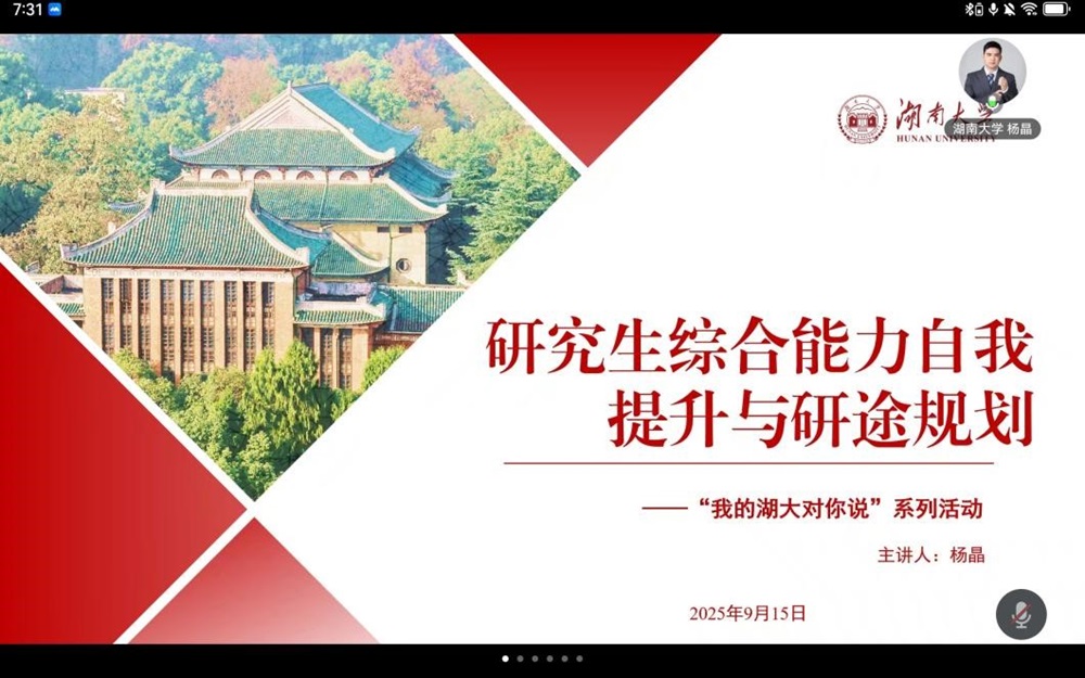 2025年9月15日,湖南大学公共管理学院“我的湖大对你说”活动顺利开展,公共健康与社会保障研究所所长、副教授、博士生导师杨晶老师为全体新生带来了一场题为《研究生综合能力自我提升与研途规划》的专题讲座。杨晶副教授从自身丰富的教学与研究经验出发,鼓励同学们尽快实现从“学习者”到“探索者”的角色转变,强调研究生阶段应注重批判性思维与创新能力的培养,通过科学方法拓展学术视野,实现从知识积累到学术创造的飞跃。